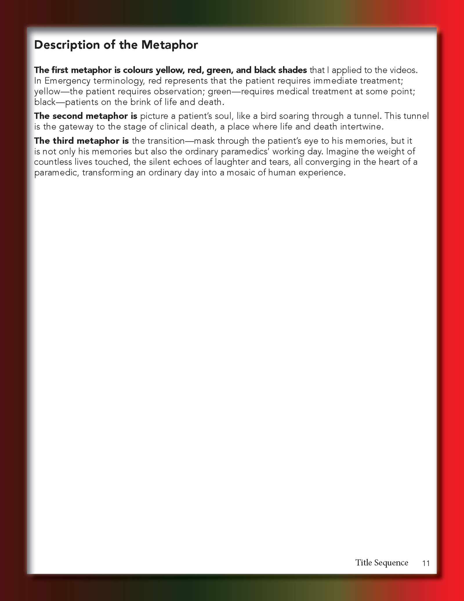 A title sequence project tells a background story about one day in ordinary paramedic life and presents the title and cast members using conceptual visuals and sound.