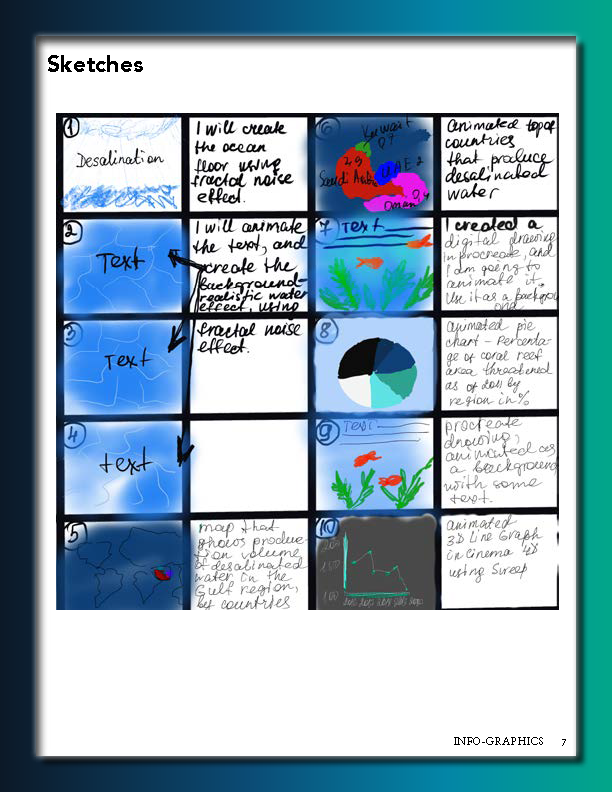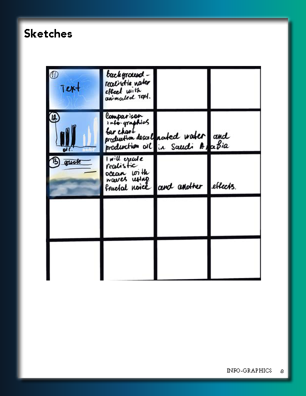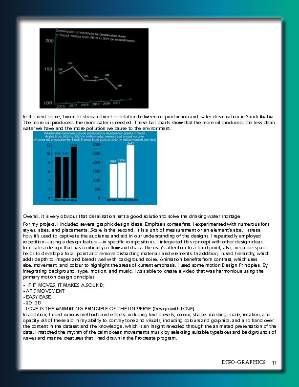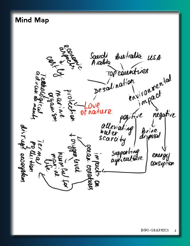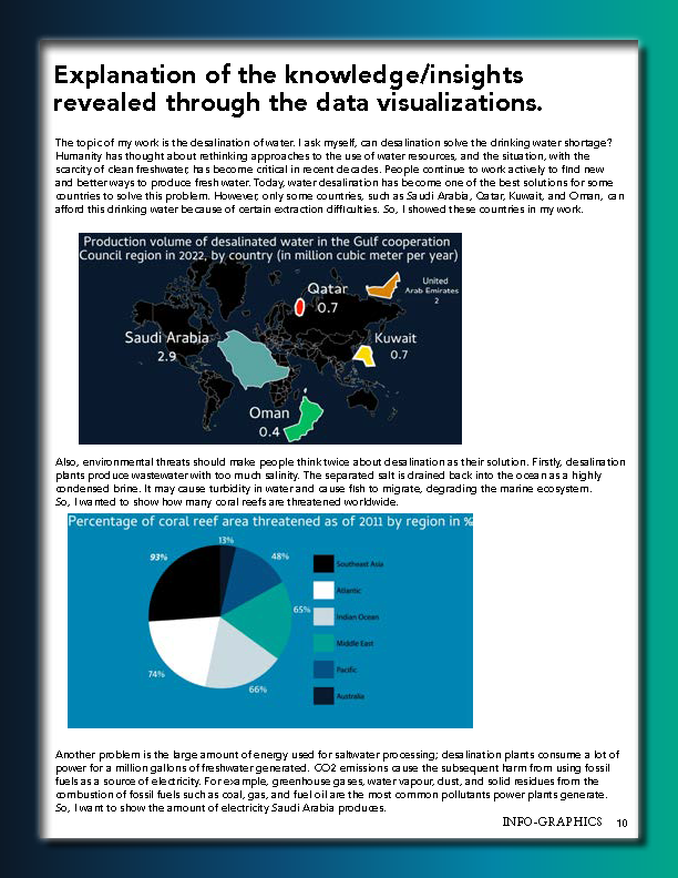 It is an infographic project that displays graphics information, data, and knowledge aimed at conveying intricate details about desalination swiftly and clearly to the viewers.